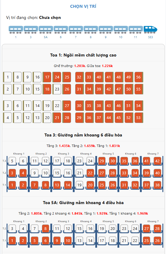 Ngồi mềm điều hòa | NML | 350.000 - 550.000 | Ghế bọc da có thể ngả 15-30 độ, điều hòa trung tâm. Phù hợp với hành khách đi tàu ngày và muốn tiết kiệm chi phí. |