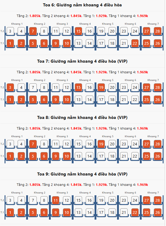 Khoang VIP (2 giường) | VIP | 1.200.000 - 1.600.00 | Chỉ xuất hiện trên tàu QB hoặc các toa tàu du lịch xã hội hóa. Không gian riêng tư và sang trọng. |