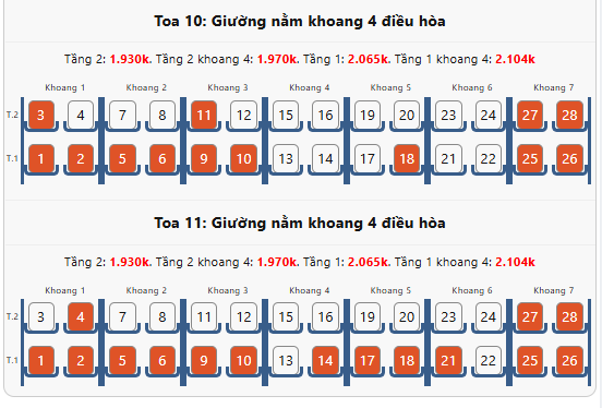 Nằm khoang 4 (Tầng 2) | BnL | 850.000 - 950.000 | Có 2 tầng, không gian rộng rãi, đệm dày và êm hơn khoang 6. |