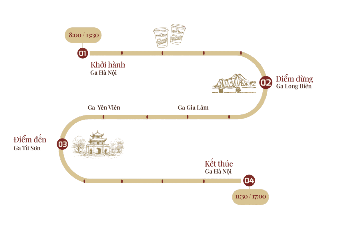 - Hoạt động: Tàu dừng khoảng 20 phút. Du khách có thể xuống tàu để chụp ảnh tại ga và ngắm nhìn cầu Long Biên.
